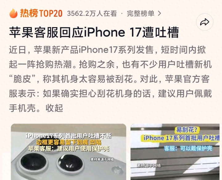 最近iPhone首批用户的吐槽已经冲上了热搜,没想到以品质最优著称的iPhone也会出现这种质量问题,但其实并不是第一次,上一代的iPhone16就传出过镜头进灰的消息。除了手机材质,iPhone17的软件同样存在一些问题。自拍照片歪斜、第三方App(如美图秀秀)无法正常使用等问题。